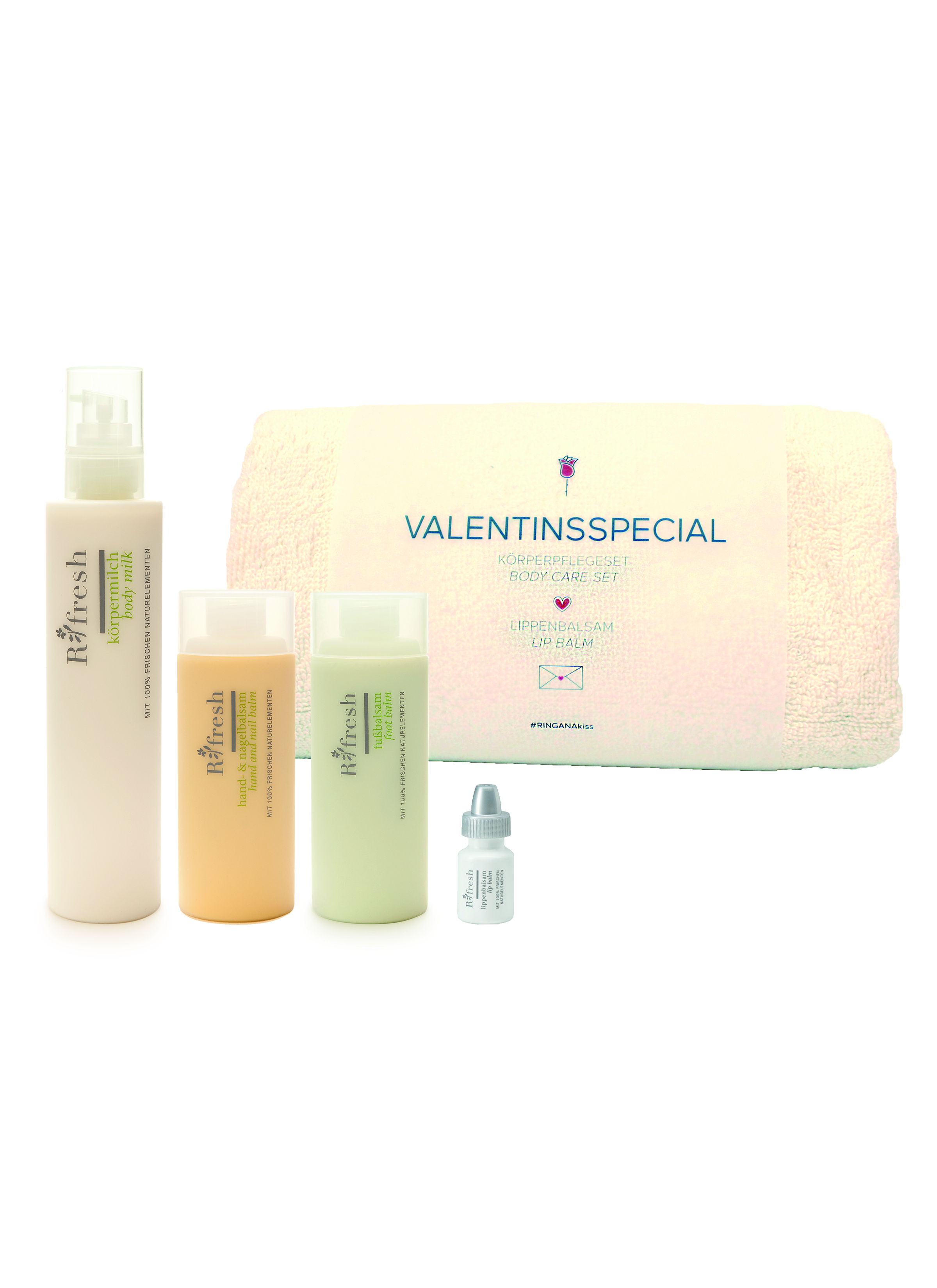 Unser spezieller Pflegetipp für den Valentinstag: Alle vier Produkte ganz langsam von den Lippen bis zu den Füßen einmassieren lassen …