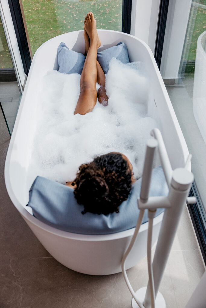 Natalie Steger: Die Idee wurde 2019 geboren. Mein Mann und ich hatten gerade neu gebaut und uns den Wunsch einer großzügigen, freistehenden Badewanne erfüllt. Doch bei meinem ersten Badeerlebnis wich die Vorfreude schnell der Ernüchterung: Meine Füße reichten nicht bis zum Wannenende, ich fand weder Halt noch eine bequeme Position – an Entspannung war nicht zu denken. Eine Lösung für das Problem konnte ich nirgends entdecken. Also reifte der Entschluss, selbst aktiv zu werden – und ein Produkt zu entwickeln, dass das Baden bequem macht. In dieser Zeit lernte ich Annika kennen. Auch sie war auf der Suche nach einer neuen beruflichen Perspektive. Wir sind beide Mütter von drei Kindern, teilen ähnliche Werte – und die Vision, das Badeerlebnis völlig neu zu denken. So entstand unser gemeinsames Herzensprojekt „Badesofa“ – ein echter Game Changer, der das Gefühl eines Sofas in die Badewanne bringt.