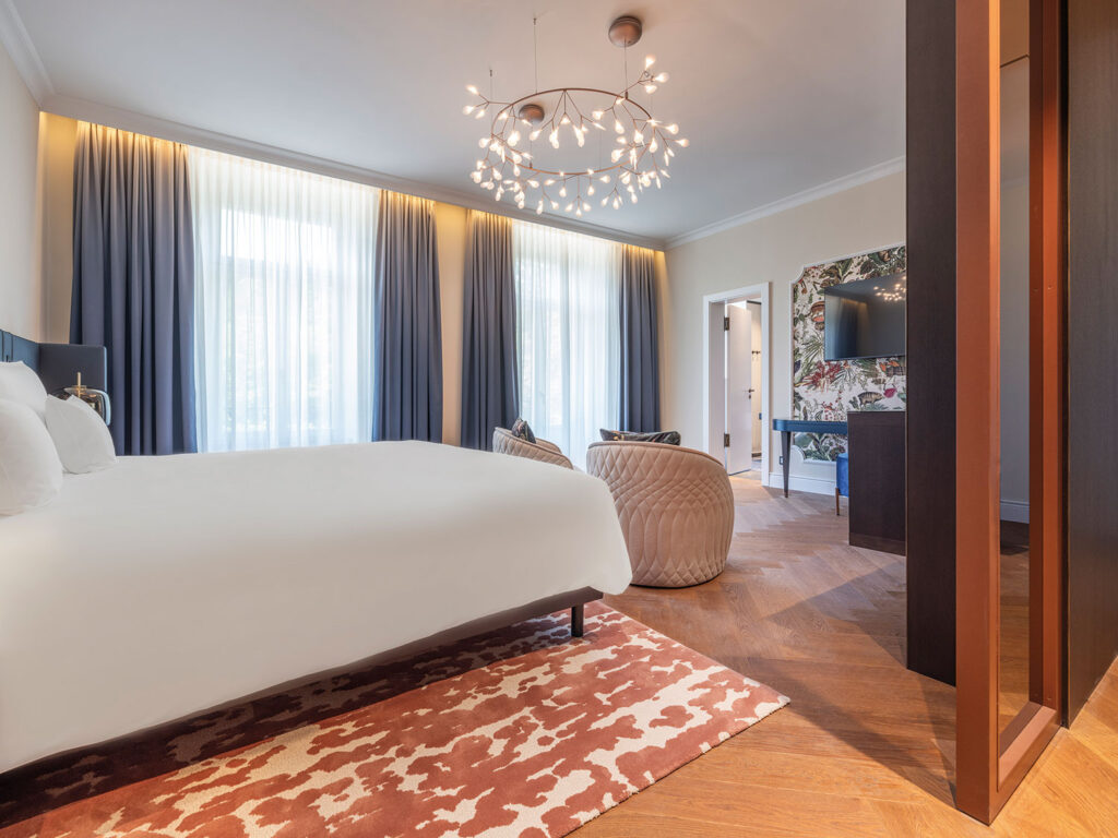 Es ist schon ein Erlebnis, durch die neu eröffneten Räume des Hotels zu laufen, Neues und Altes zu entdecken, so wie beispielsweise die überdimensionale Perlenkette, die von der Decke des aufwändig renovierten Treppenhauses hängt. Sie soll eine Hommage an Grandes Dames wie Kaiserin Sisi oder Marlene Diedrich sein, die hier logierten. Auf dem Weg zum Zimmer fallen mir die Motive auf den Teppichen sofort ins Auge. Feine Zeichnungen von Schmetterlingen, Frauen in eleganten Roben, Männern in Frack und Zylinder und Kindern, die munter den Flur entlang hopsen – alle scheinen bereit, in der nahen Lichtentaler Allee zu flanieren.