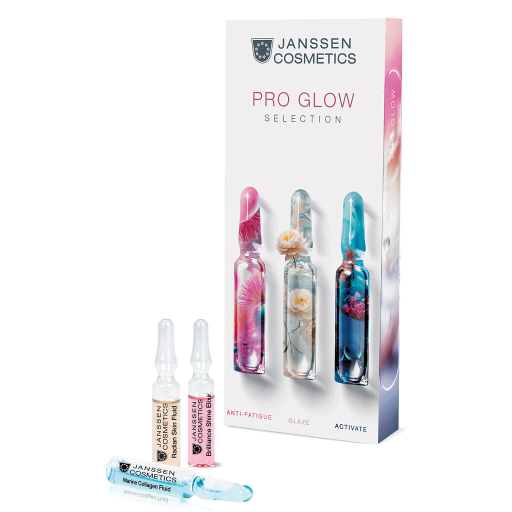 7-Tage-Kur Eine Ampullenkur für glattere, straffere, jugendlich strahlende Haut ist die Pro Glow Selection von Janssen Cosmetics. Drei aufeinander abgestimmte Formeln wirken gezielt gegen Trockenheit, Müdigkeitsanzeichen und feine Linien. Hyaluronsäure, Collagen, Algen- und Blütenextrakte spenden Feuchtigkeit, revitalisieren und schützen. 7 x 2 ml, 33,50 €. www.janssen-cosmetics.com