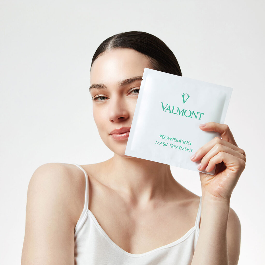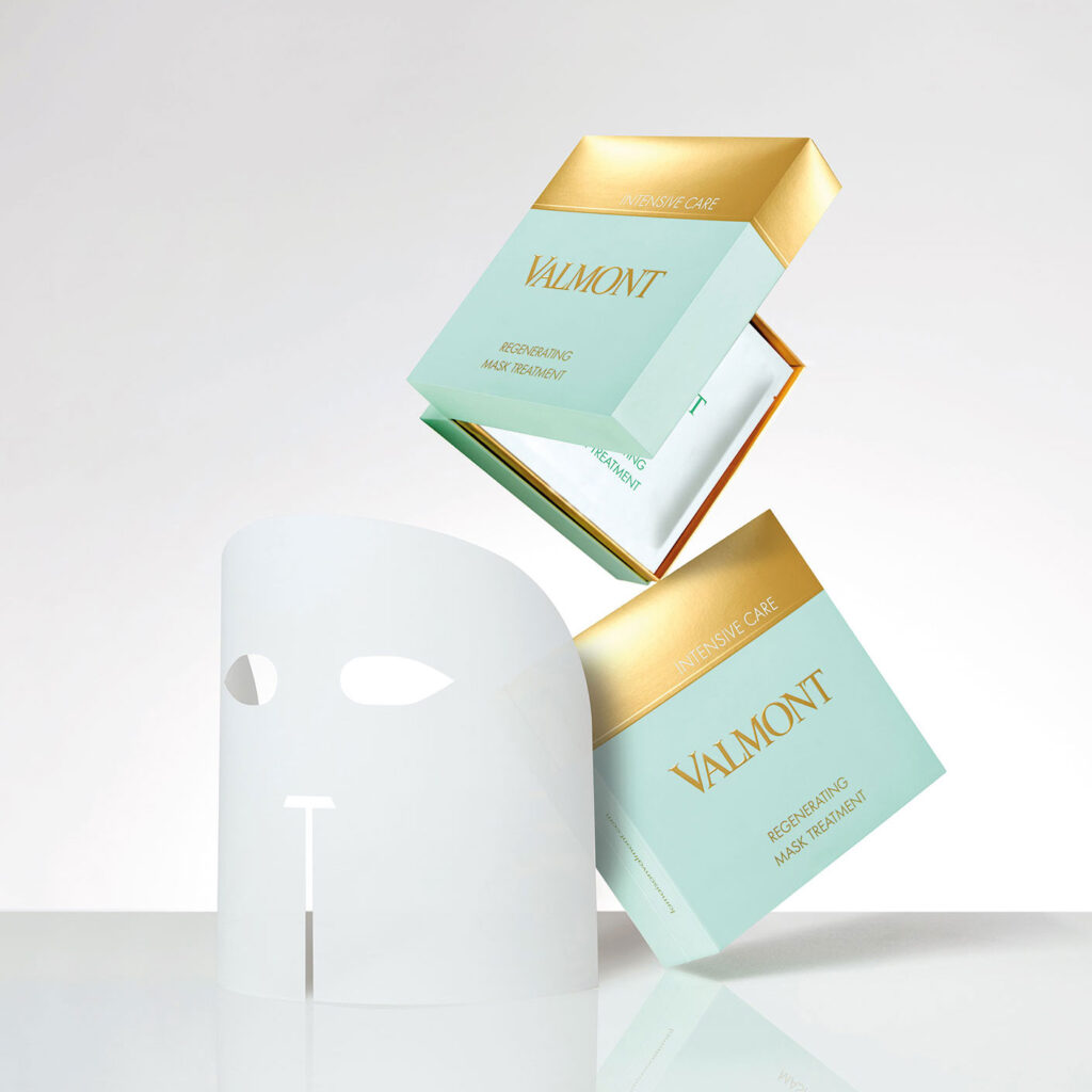 Native Kollagenfasern und -moleküle sorgen im Regenerating Mask Treatment von Valmont für optimale Feuchtigkeitsübertragung. Die biomimetischen Kollagenpeptide dringen in tiefere Hautschichten ein und regen die natürliche Kollagensynthese an. Enthält eine Vliesmaske. 155 €. www.lamaisonvalmont.com