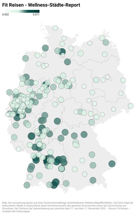 Wie stark ist das Bedürfnis deutscher Städter nach Wellbeing? Dieser Frage ist der Wellnessreise-Veranstalter Fit Reisen auf den Grund gegangen. Dazu wurde das Suchverhalten in den 200 größten deutschen Städten analysiert. Das Ergebnis offenbart deutliche regionale Unterschiede, überraschende Spitzenreiter und lässt erkennen, dass Einkommen sowie die Nähe zu beliebten Wellnessregionen entscheidende Faktoren für das Suchinteresse sind. Schon ein erster Blick auf die Ergebnisse zeigt, dass Wellness in Deutschland kein Großstadtphänomen ist. Vor allem kleinere Städte im Süden und Westen weisen ein besonders starkes Interesse an Erholung auf, während Metropolen wie Berlin oder Bremen überraschend selten nach entsprechenden Angeboten suchen. Zugleich zeigt sich, dass viele Städter vor allem Angebote aus ihrer näheren Umgebung bevorzugen.