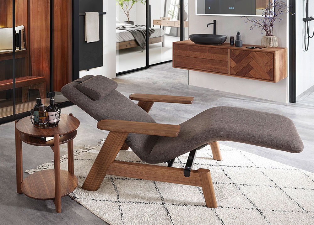Die Wellnessliege Somra in Zusammenarbeit mit dem Designer Sebastian Herkner entstanden. Ihre weichen, fließenden Formen, die warmen Holzvarianten und die präzise eingearbeitete Polsterung sind inspiriert von der Ruhe des Zen und laden dazu ein loszulassen. Die vollflächige Wärmefunktion sorgt für eine sanfte, gleichmäßige Erwärmung des Körpers vom Nacken bis zu den Füßen. Diese tiefenwirksame, wohltuende Wärme verlängert die regenerierende, gesundheitsfördernde Kraft des Saunabads. Handgefertigt in Deutschland, soll Somra Ausdruck von Achtsamkeit gegenüber Material, Detail und Mensch sein.