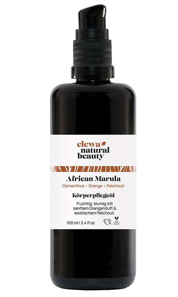 Das Körperöl African Marula mit Osmanthus, Orange & Patschuli von Elewa, einer Pflegeserie, die auf afrikanischen und südamerikanischen Ölen basiert, betört mit seinen Aromen. Es regeneriert, beugt vorzeitiger Hautalterung vor und wirkt feuchtigkeitsbindend. Vitamin C unterstützt die hauteigene Kollagenproduktion, Vitamin E schützt die Haut vor freien Radikalen.