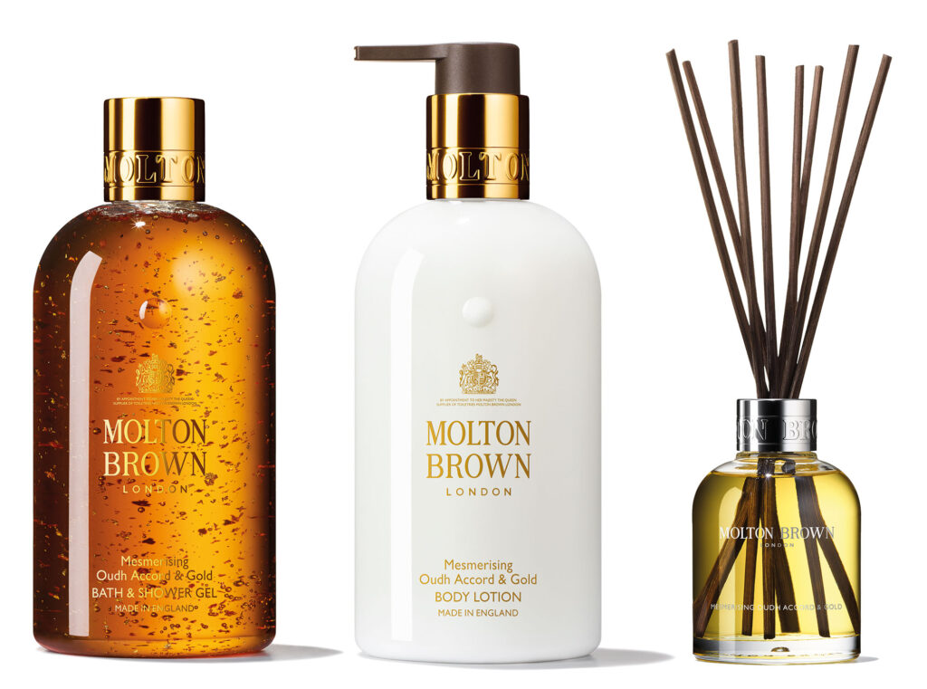 Im Winter darf es etwas luxuriöser im Badezimmer zugehen. Dafür ist die Kollektion Mesmerising Oudh Accord & Gold von Molton Brown perfekt geeignet. Die würzige Tiefe des Waldes, satte Hölzer, honighaltige Harze und rauchige Noten verschmelzen zu einem opulenten Duft. Bade- und Duschgel 300 ml, 32 €; Body Lotion 300 ml, 35 €; Duftstäbchen 150 ml, 62 €. www.moltonbrown.de