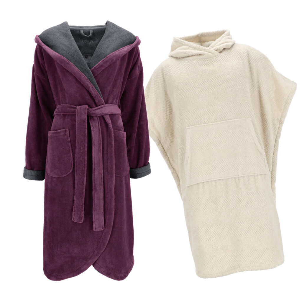Damit machen Sie im Spa garantiert eine gute Figur! Der lässig geschnittene Bademantel Carmen im Doubleface-Look ist besonders flauschig, das Unisex-Cape Timo aus 100 Prozent Baumwolle im stylishen Streifendesign kann man einfach überwerfen. Von Vossen, je 79,99 €. www.vossen.com