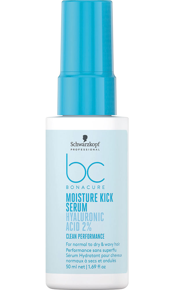 Die federleichte Textur des BC Bonacure Moisture Kick Hyaluronic Serum von Schwarzkopf Professional versorgt sprödes Haar intensiv mit Feuchtigkeit, macht es kämmbar und glänzend. 50 ml, 20,49 €. www.schwarzkopf.de
