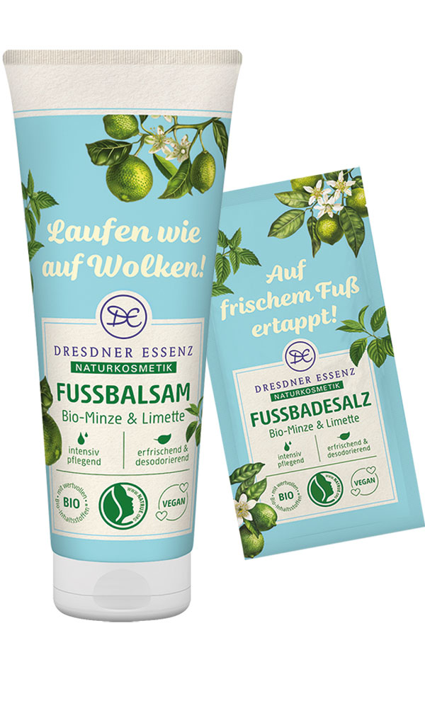 Der Fußbalsam mit ätherischem Bio-Minz- und Limettenöl (75ml, 2,99 €) erfrischt müde Beine, zieht schnell ein und sorgt für streichelzarte Frische. Ergänzt wird der Balsam vom Fußbadesalz (40g, 1,29 €) mit ätherischen Ölen und Menthol – für seidige Haut und spürbar leichte Beine. www.dresdner-essenz.com