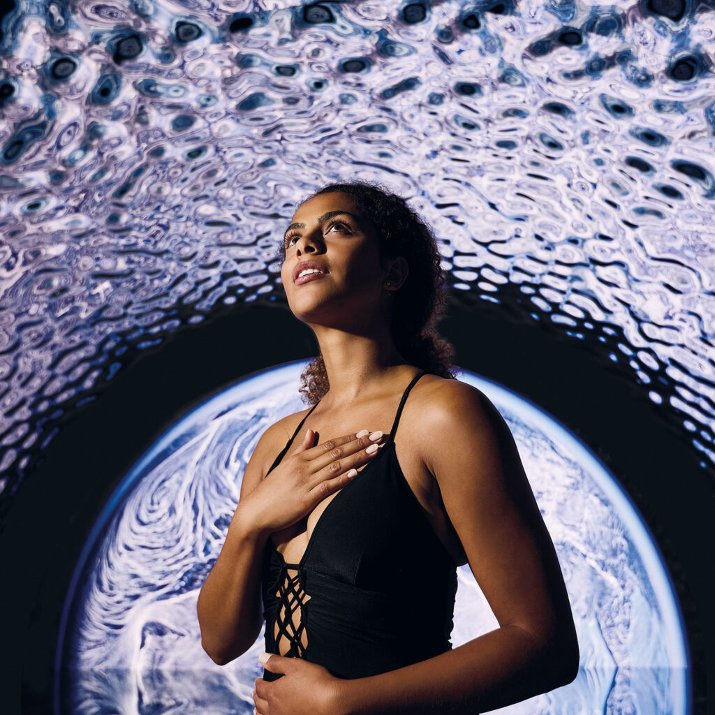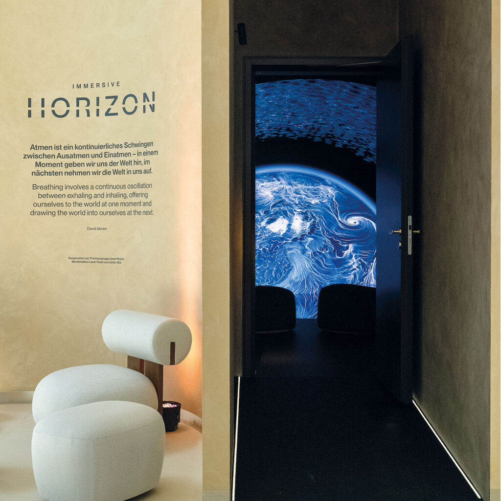 Architektur, Kunst, Technologie und Wissenschaft verschmelzen zu einem multisensorischen, ganzheitlichen Erholungskonzept, das wissenschaftlich fundiert ist und zugleich emotional berührt. Basierend auf Daten der Nasa, erleben die Gäste eine zehnminütige Atemmeditation, begleitet von Tönen, Farben, Licht und Duft. Mithilfe von Spiegeln und dank einer speziellen Oberfläche aus onduliertem Chrom scheint der Raum selbst zu atmen und zu pulsieren. Das Ergebnis: mehr Ruhe und Balance.