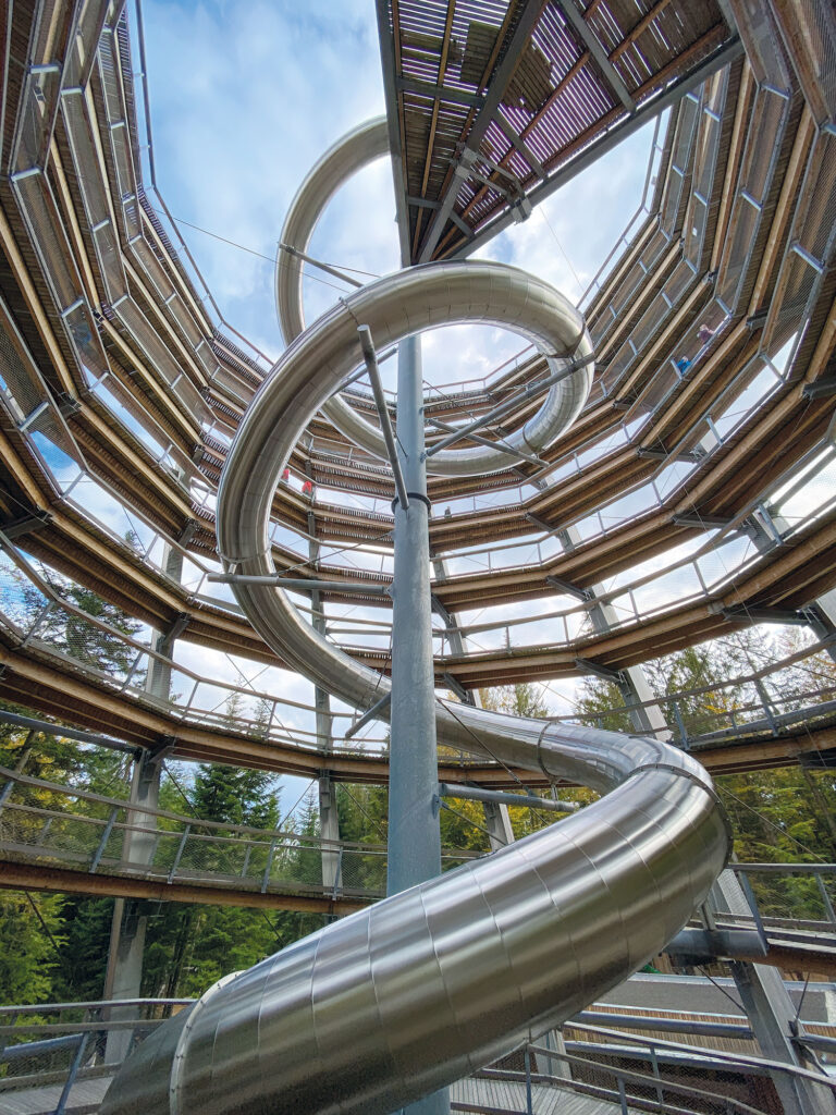 Der Baumwipfelpfad in Bad Wildbad ist ein spektatuläres Erlebnis für Groß und Klein. Auf 1250 Metern und bis zu 20 Meter über dem Waldboden schlängelt er sich durch Buchen, Tannen und Fichten. Highlight ist der Turm mit seiner luftigen Architektur und einer 55 Meter langen Rutsche. Die Aussichtsplattform befindet sich auf 804 Meter.