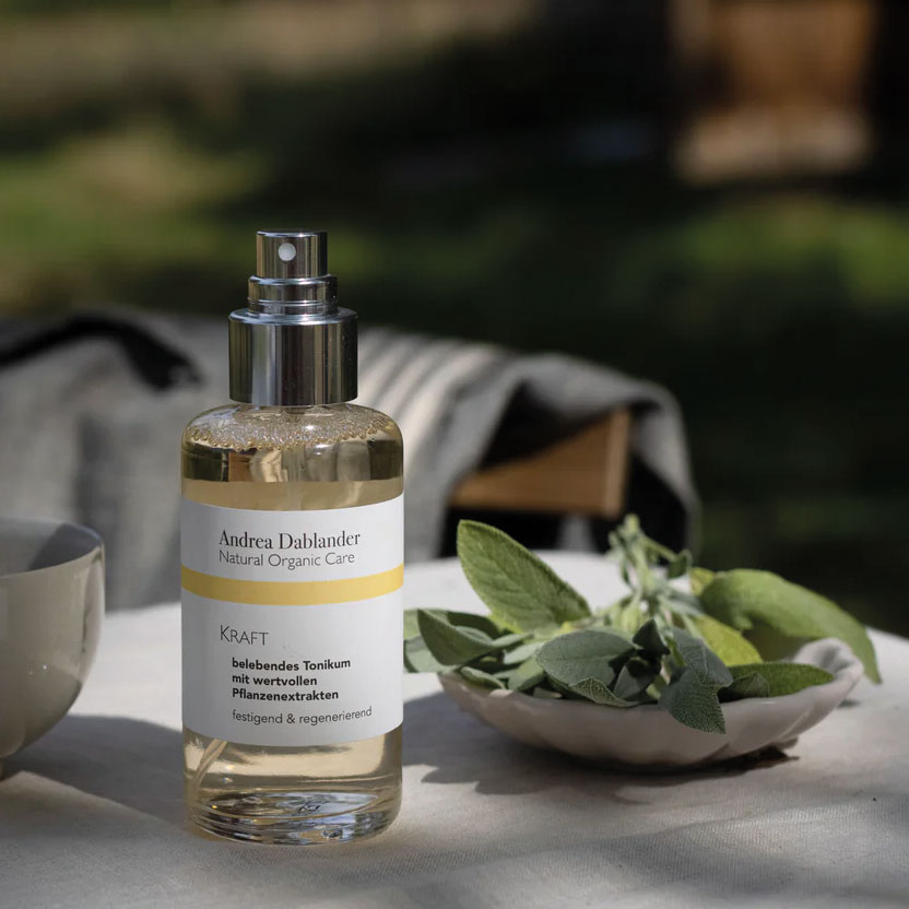 Andrea Dablander Ackerminze, Rosmarin und Weißtanne sind die Hauptakteure des belebenden Tonikums „Kraft“. Es klärt Unreinheiten, aktiviert den Hautstoffwechsel, fördert die Regeneration und duftet wunderbar balsamisch-waldig, frisch und minzig. 100 ml, 29,90 €. www.andreadablander.com
