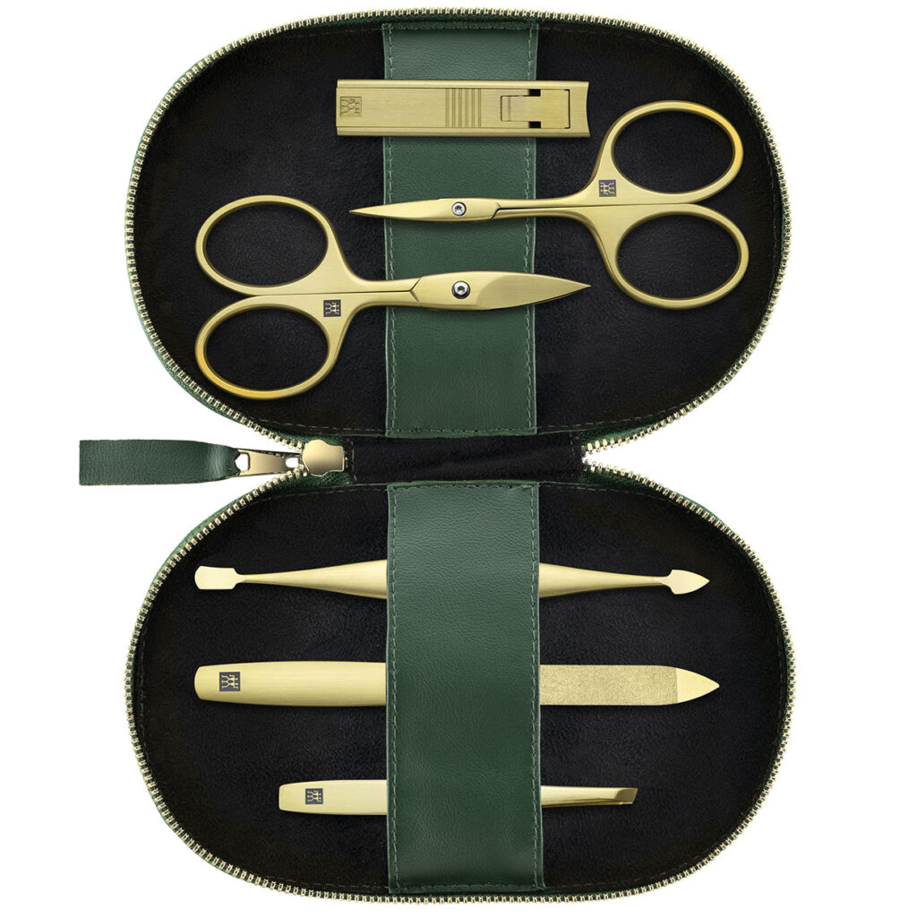 Aus veganem Apfelleder besteht das Maniküre-Set von Zwilling Beauty. Es wird ressourcenschonend aus Apfeltrester gefertigt, einem Nebenprodukt der Saft- und Lebensmittelproduktion. Das Material ist so strapazierfähig wie Echtleder. Erhältlich in sattem Grün, Schwarz und edlem Grau mit Premium Tools in Gold. 6-teilig, 249,95 €. www.zwillingbeauty.com