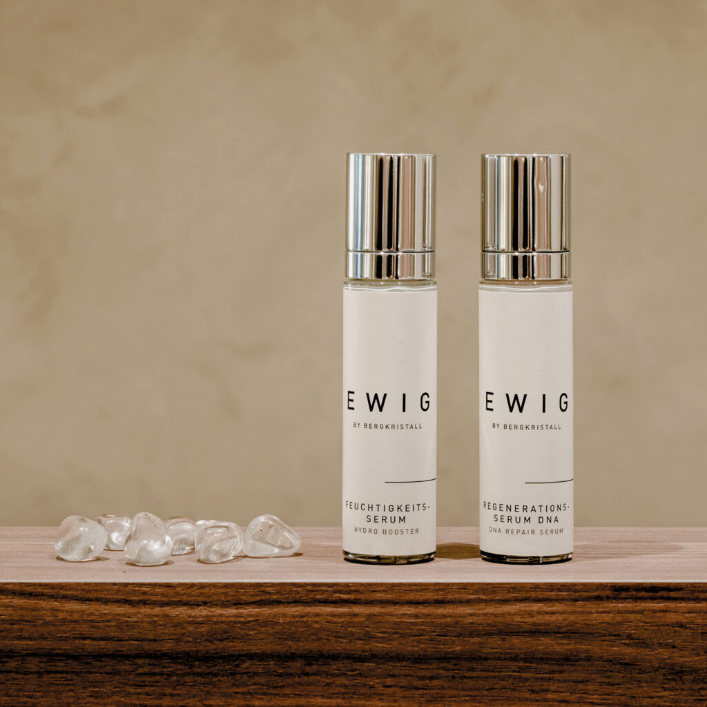 „Ich wollte etwas schaffen, das nicht nur die Schönheit unserer Natur widerspiegelt, sondern auch das besondere Lebensgefühl im Bergkristall. Das Ankommen bei sich selbst, die Ruhe und die Harmonie“, erklärt Gastgeberin Sabine Lingg. Mit der eigenen Kosmetiklinie „Ewig by Bergkristall“ ist ihr das rundum gelungen. Die Produkte sind vegan, klimaneutral produziert sowie biozertifiziert und entstanden in enger Zusammenarbeit mit einem nahe gelegenen Forschungsinstitut. Der Name „Ewig“ steht für die Sehnsucht nach zeitloser Schönheit und das Festhalten besonderer Momente – solcher, die die Gäste im Resort erleben. Neben ausgewählten Inhaltsstoffen und reinem Alpenquellwasser ist auch fein gemahlener Bergkristall in den Produkten zu finden. Zum Sortiment gehören Reinigungsmilch, Tonikum, Enzympeeling, Tages- und Nachtcreme, zwei Seren sowie Augen- und Lippenpflege. Im Kristall Spa kann man zwei Signature-Anwendungen exklusiv mit Produkten von „Ewig by Bergkristall“ genießen. Weitere Kosmetikmarken im Spa: Pharmos Natur, La Biosthétique und Ebenholz.