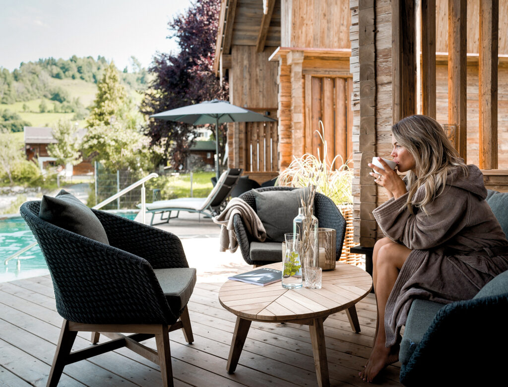 Alpzitt Chalets Was diese Chalets so besonders macht? Der Duft von Altholz, das Knistern des Kamins an kühlen Abenden, weiche Stoffe und eine warme Atmosphäre. Hier im Chaletdorf am Fuße des Bergs Grünten im Oberallgäu, ist der Alltag ganz leise, der Schlaf im Zirbenholzbett so erholsamen wie selten. Private Wellness-Momente gehören hier so selbstverständlich dazu wie feine Kulinarik im Restaurant Genusswerk. Die Gäste genießen ihre eigene Sauna im Chalet, einen Outdoor-Whirlpool und Schwimmen im Natursee. Eine schöne Ergänzung ist der neue Spa-Bereich mit Fitness- und Ruheraum sowie Behandlungsräumen für ein Extraplus an Verwöhnzeit. www.alpzitt-chalets.de