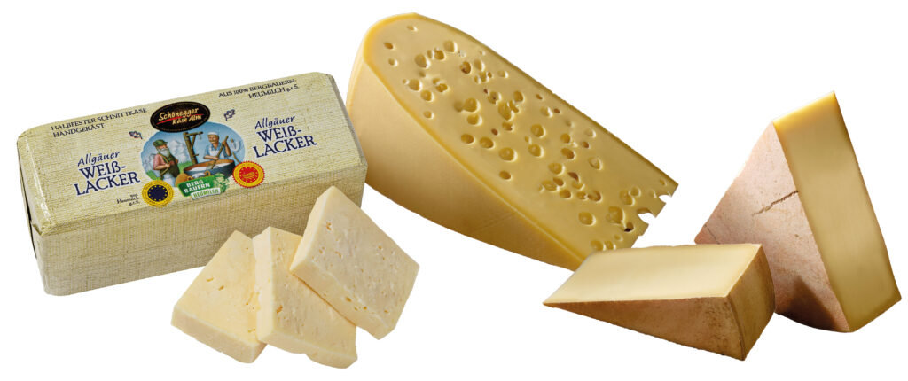 - Weißlacker Pikant, leicht scharf mit fünfprozentigem Salzgehalt, erinnert dieser Weichkäse auch optisch an Feta. Er muss 12 bis 15 Monate reifen. Der halbfeste Schnittkäse ist beliebte Zutat bei Allgäuer Kässpatzen.