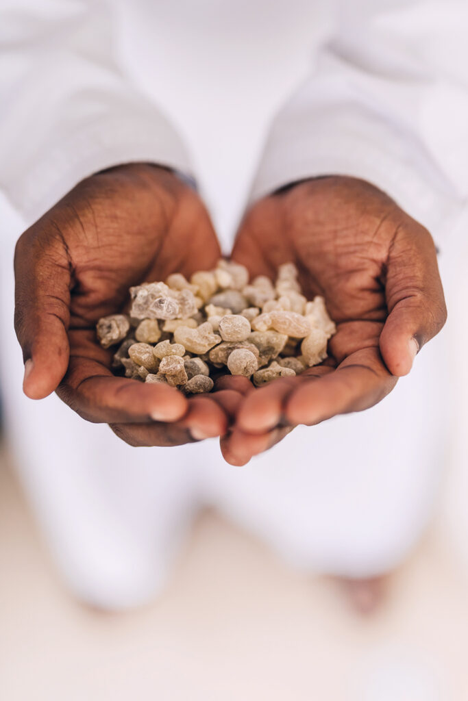 Anders der allgegenwärtige Duft von Weihrauch, der diese Region so unverwechselbar macht. Im „Anantara“ in Salalah erklärt man uns, wie das kostbare Harz gewonnen wird: Mit einem kleinen Messer wird der Stamm des Weihrauchbaums angeritzt, Harz tritt aus. Das weiße, milchige Harz wird getrocknet und zum Kauen oder Trinken verwendet – ihm werden entzündungshemmende, verdauungsfördernde und mundhygienische Eigenschaften nachgesagt. Das gelbliche Harz wird verbrannt und hüllt die Umgebung in den typisch warmen, schwer-aromatischen Rauch.