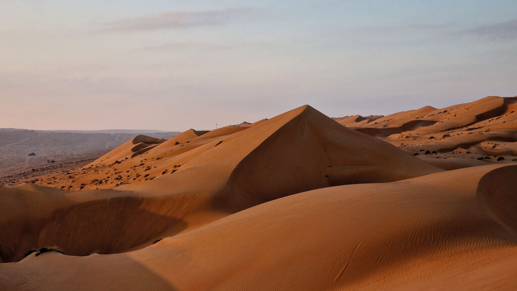 Jenseits der Oasen, im Landesinneren, wartet das radikale Kontrastprogramm: Weite Ebenen und Hügel in unzähligen Brauntönen im Wechsel, bis es bald noch karger wird. Auf uns und unsere Kinder wartet ein Wüstencamp in einem 12 000 Quadratkilometer großen Sandkasten, der Ramlat-Al-Wahiba-Wüste, besser bekannt als Wahiba Sands. Ist schon die Fahrt mit dem Jeep dorthin spektakulär, erwartet uns das eigentliche Highlight dann in der Dämmerung: Riesige Sandwellen bewegen sich, geformt vom Wind, der den Sand unaufhörlich vor sich hertreibt – fast wie die Gezeiten des Meeres. Die Farbpalette reicht von hellem Weiß bis zu tiefem Rostrot. Dazu dieses magische Wüstenlicht und ein gigantisches Sternenzelt.