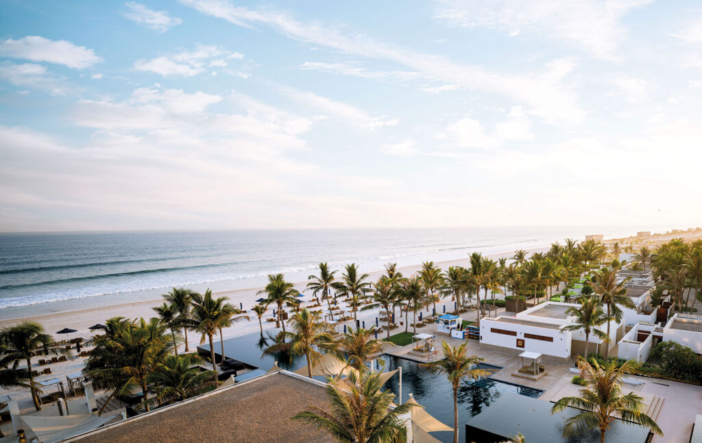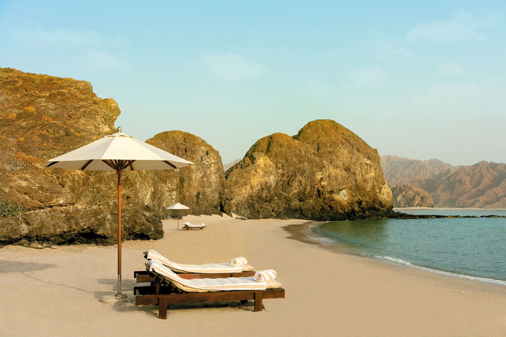 Al Bustan Palace, a Ritz-Carlton Hotel Hier kommt man aus dem Staunen kaum heraus. Gäste werden in diesem 5-Sterne-Hotel in einer 38 Meter hohen Palasthalle empfangen – ausgestattet mit glänzendem Marmor, Kristallleuchtern und einer riesigen Kristallfontäne. Im gesamten Hotel treffen traditionelle arabische Architektur und Handwerkskunst auf modernen Luxus: In den 250 komfortablen Zimmern und Suiten, im Spa, aber auch in der vielseitigen Kulinarik des Hauses, die asiatische, italienische, und mediterran-omanische Küche bietet. Errichtet wurde der märchenhafte Palast vom verstorbenen Sultan Quaboos – für seinen Nachfolger und die Regierungsbeamten ist bis heute das oberste Stockwerk reserviert – mit überwältigendem Ausblick! Denn das Haus liegt eingebettet zwischen den schroffen Felsen des Hajar-Gebirges und dem palmengesäumten Golf von Oman. Am Strand vor türkisfarbenem Meer lässt es sich auf Day Beds und Liegen wunderbar verweilen. Eine Bucht weiter kann sich Frau am Ladys-only-Beach zurückziehen. Er ist ans großzügige Spa angeschlossen, das neben Sauna, Dampfbad und Indoor-Pool vor allem mit authentischen omanischen Anwendungen begeistert.