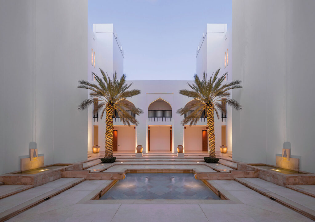 The Chedi Muscat Nur 15 Minuten vom Flughafen Muskat entfernt, direkt am Strand von Al Ghubra, liegt das Designhotel „The Chedi“. Es versetzt uns mit seiner klaren, asketischen Geometrie und einer überschaubaren Farbwelt aus grünen Palmen, weißen Gebäuden und tiefblauem Wasser sofort in meditative Urlaubsstimmung. Der perfekte Ort zum Ankommen und Durchatmen nach einem langen Flug oder einer Rundreise. Wer auch im Urlaub seine Gesundheitsroutine nicht vernachlässigen möchte, der ist im riesigen „Health Club“ richtig, er bietet nahezu alles, was es für ein ganzheitliches Training braucht. Müde Muskeln werden in Sauna oder Dampfbad sanft wiederbelebt – oder man gönnt sich gleich ein Treatment, wie zum Beispiel die „The Chedi Exclusive“-Massage, bei der sanfte Stretcheinheiten und Griffe aus alten Heiltechniken gezielt Verspannungen lösen. Und danach? Vielleicht eine Runde am „Long Pool“ relaxen. Mit seinen 100 Metern ist er nicht nur bei Schwimmern äußerst beliebt, sondern durch seine ikonische Inszenierung aus Wasser, Palmen und Feuerschalen längst zu einem festen Bestandteil vieler Reise-Bucketlists geworden. Abends geht es dann in eines der sechs sterneverdächtigen Restaurants, die sich am Meer, im Hauptgebäude oder entlang der drei Pools verteilen. Nach Meeresfrüchten, Mezze und Rosenwasser-Dessert geht es satt und zufrieden ins kuschelige King-Size-Bett – oder man genießt auf der Terrasse noch einmal die besondere Zen-Aura des Hauses. Einatmen. Ausatmen. Loslassen.