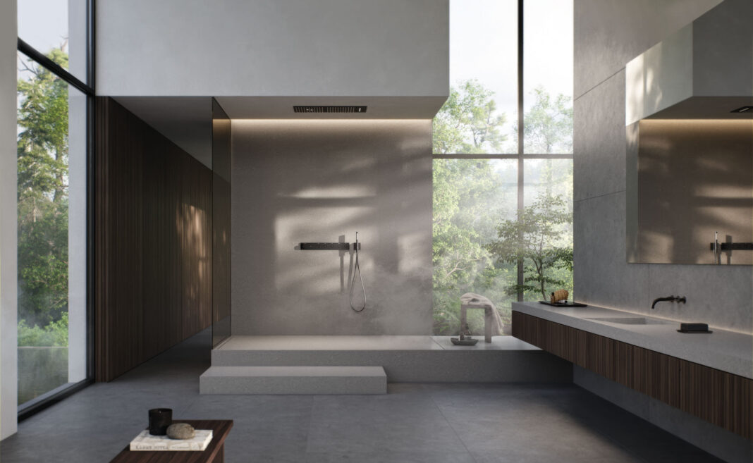 Grohtherm Aqua Tiles von Grohe soll einzigartige Duscherlebnisse schaffen. Das Unterputz-Thermostat aus Metall im minimalistischen, horizontalen Design zeichnet sich durch versenkbare Tasten aus, die sich nahtlos in die Abdeckplatte einfügen und nur bei Aktivierung dezent hervortreten. Das Thermostat unterstützt bis zu fünf Duschfunktionen. Der Wechsel zwischen Hand-, Kopf- und optionalen Seitenbrausen sowie die Auswahl verschiedener Strahlarten erfolgen intuitiv. In Kombination mit den modularen Rainshower Aqua Tiles Deckenbrausen wird Badgestaltung noch individueller. Die Elemente können horizontal, vertikal oder im rechten Winkel platziert werden – abgestimmt auf Raum und persönliche Wünsche. Eine weitere Ergänzung bildet die Rainshower Aqua Kopfbrause, die wahlweise in runder (360 mm Durchmesser) oder rechteckiger Form (400 mm × 230 mm) erhältlich ist. Zwei Strahlarten sorgen für Abwechslung: Rain, angelehnt an wohltuenden Sommerregen, und ActiveRain, ideal zum Ausspülen von Shampoo und für einen belebenden Massagestrahl. Die Handbrause komplettiert das Wellness-Erlebnis mit drei Strahlarten.