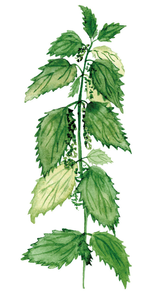 Die meisten von uns kennen das Kraut aufgrund schmerzhafter Begegnungen: Bei Berührung brechen die vielen kleinen Brennhaare und geben eine ätzende Flüssigkeit frei. Dennoch ist die Brennnessel eines der stärksten wilden Heilkräuter. Ernten kann man sie von März bis in den tiefen Herbst hinein, am besten mit Gartenhandschuhen. Um die Brennhaare unschädlich zu machen, werden die Blätter entweder erhitzt oder mit dem Nudelholz bearbeitet. Brennnessel ist in der Küche vielseitig einsetzbar, vom Tee über Suppe oder Gemüsebeilage nach Art von Spinat bis hin zu Knödel oder Pfannkuchen. Sie schmeckt schön grün mit einem Hauch von Alge, enthält u.a. Kalium, Magnesium, Kalzium, Phosphor, Eisen, Vitamin C sowie Kieselsäure und wirkt entwässernd, entgiftend, entzündungshemmend und krampflösend.