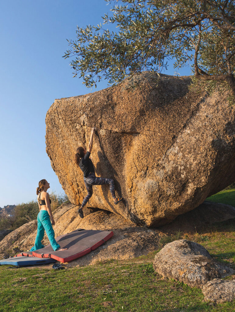Wen die Boulder-Leidenschaft gepackt hat, der möchte auch raus in die Natur. Der Wald von Fontainebleau mit seinen rund 35 000 bizarren Felsblöcken ist das größte Boulder-Revier der Welt. Schon im 19. Jahrundert trainierten hier Pariser Kletterer für die Alpen. Ein weiteres Dorado befindet sich im Schweizer Averstal: Der sogenannte „Magic Wood“ (magischer Wald) bietet eine Vielfalt an Boulder-Möglichkeiten in einer zauberhaften Atmosphäre aus Wasser, Wald und Felsen. In Deutschland locken der Pfälzerwald, die Eifel oder die Sächsische Schweiz. Beim Bouldern im Freien ist ein transportables Crashpad Pflicht, das beim Springen (und Stürzen) schützt.