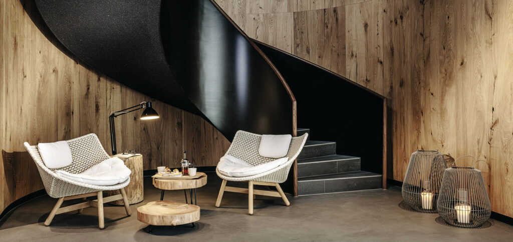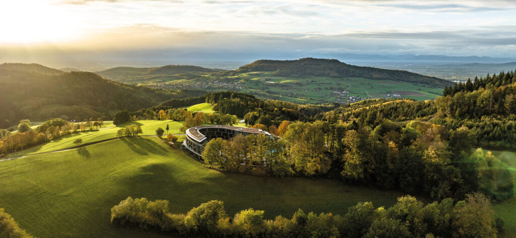 Überhaupt setzt das Hotel neue Maßstäbe in Sachen Architektur. Das Bauwerk fügt sich organisch in die Höhenlinien der Natur ein – und ist schon optisch wohltuender und inspirierender Rückzugsort auf dem Hochplateau am Westhang des Freiburger Hausbergs Schauinsland.