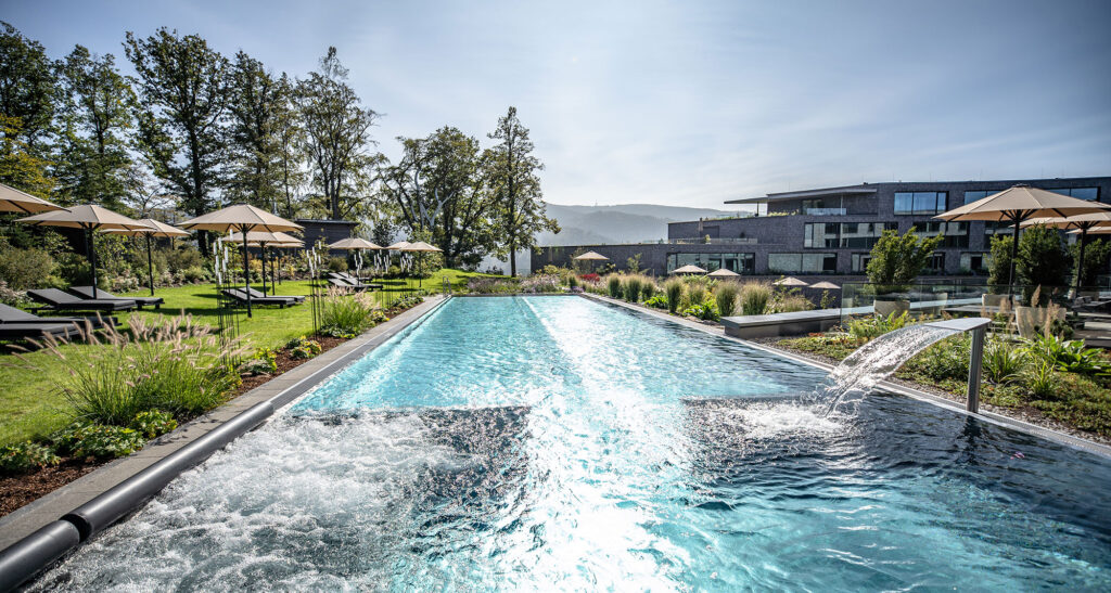 Der Wellnessbereich trägt den Namen „GesundKunft-Spa“ und sieht die nachhaltige Erholung und Regeneration des Gastes als seine wichtigste Aufgabe. Wenn man alle Innen- und Außenbereiche mit den drei Sonnendecks, dem Naturgarten, den gemütlichen Rückzugsplätzen und dem kuscheligen Waldpavillon mit offenem Kamin dazu zählt, kommt man auf 18 500 Quadratmeter!